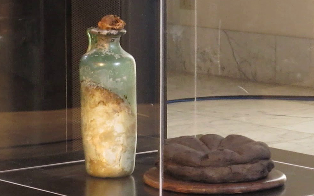La utilización de técnicas moleculares y la datación por carbono 14 de uno de los "artículos comestibles" más representativos conservados en el MANN han permitido rastrear el contenido de la botella de vidrio con un aspecto muy similar a los representados en los frescos encontrados en Pompeya. Se trata de una sustancia sólida enigmática con una consistencia cerosa, probablemente encontrada en Herculano durante las excavaciones arqueológicas iniciadas por el Príncipe de Elboeuf en 1738 y continuadas por el rey Carlos de Borbón.