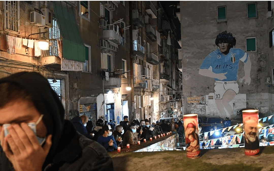 Es importante destacar, que frente al estadio del Napoli miles de personas convirtieron el cerco perimetral en un santuario con velas y banderas recordando al "Rey" de la ciudad más allá del toque de queda nocturno vigente en toda Italia por la emergencia de coronavirus. A modo de homenaje, las luces del San Paolo permanecieron prendidas toda la noche para recordarlo y permitir el último adiós de los habitantes de la ciudad del Vesubio.